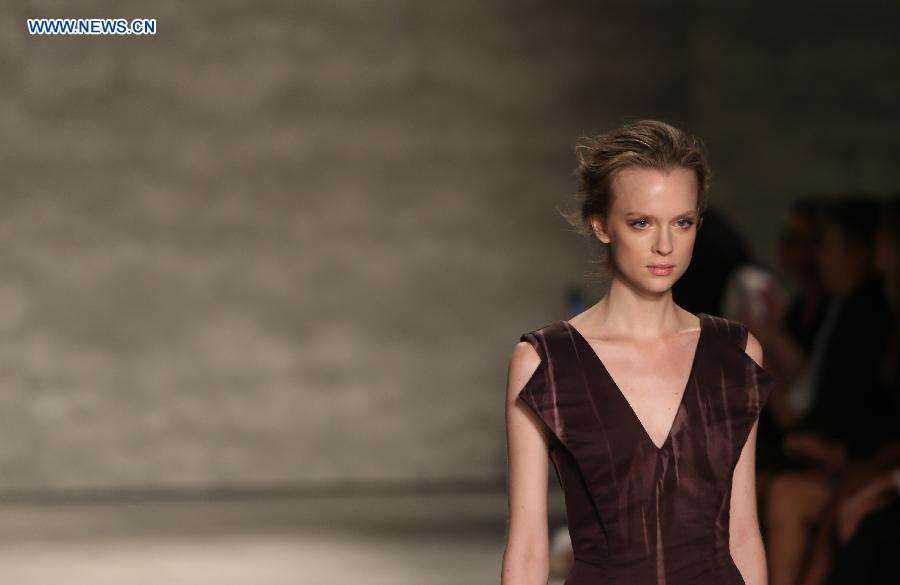A model presents a creation of the Spring/Summer 2015 SUPIMA collection during the New York Fashion Week in New York, the United States, Sept. 4, 2014. The Mercedes-Benz Fashion Week Spring 2015 opened here on Thursday. (Xinhua/Qin Lang)