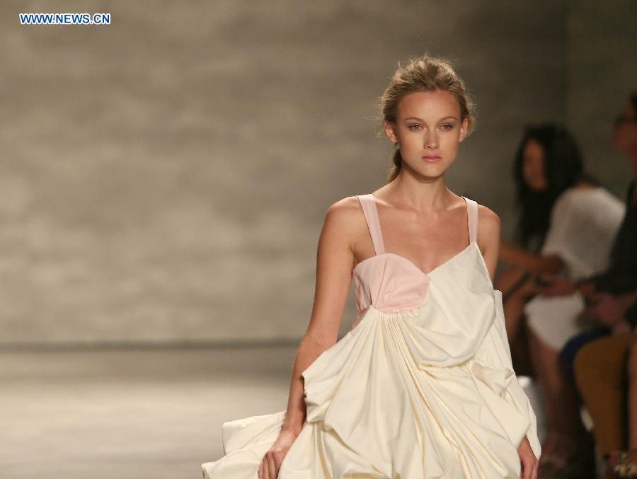 A model presents a creation of the Spring/Summer 2015 SUPIMA collection during the New York Fashion Week in New York, the United States, Sept. 4, 2014. The Mercedes-Benz Fashion Week Spring 2015 opened here on Thursday. (Xinhua/Qin Lang)