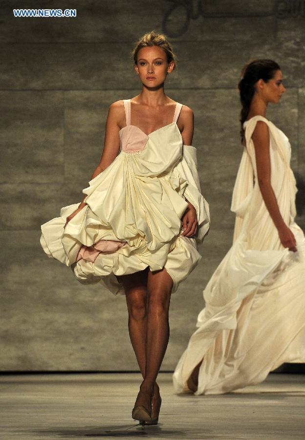 Models presents a creation of the Spring/Summer 2015 SUPIMA collection during the New York Fashion Week in New York, the United States, Sept. 4, 2014. (Xinhua/Wang Lei)