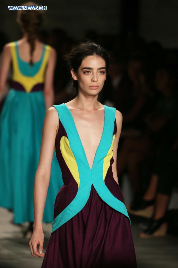 A model presents a creation of the Spring/Summer 2015 SUPIMA collection during the New York Fashion Week in New York, the United States, Sept. 4, 2014. The Mercedes-Benz Fashion Week Spring 2015 opened here on Thursday. (Xinhua/Qin Lang)