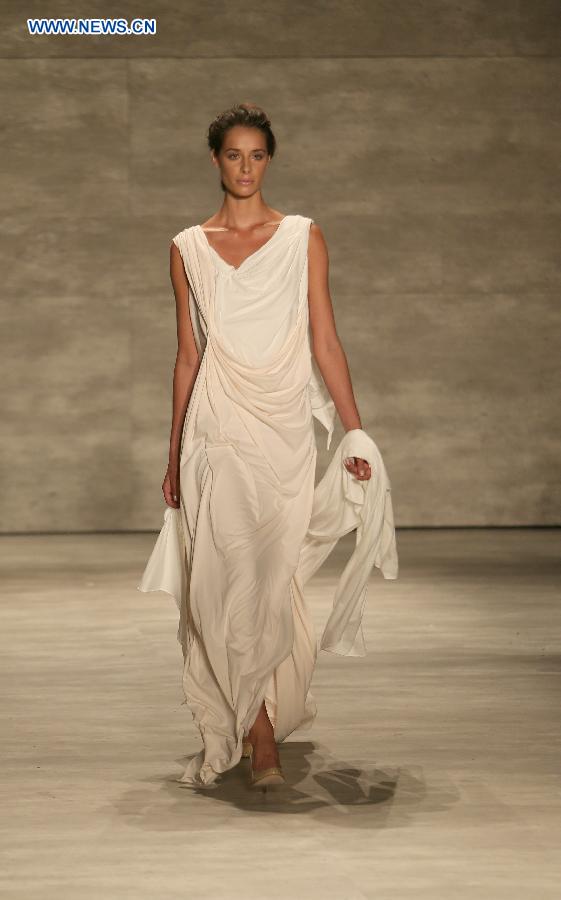 A model presents a creation of the Spring/Summer 2015 SUPIMA collection during the New York Fashion Week in New York, the United States, Sept. 4, 2014. The Mercedes-Benz Fashion Week Spring 2015 opened here on Thursday. (Xinhua/Qin Lang)