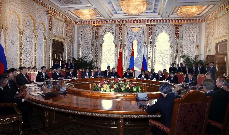 Chinese President Xi Jinping meets with Russian President Vladimir Putin and Mongolia's President Tsakhiagiin Elbegdorj,in Dushanbe, capital of Tajikistan, Sept. 11, 2014. (Xinhua/Ju Peng)
