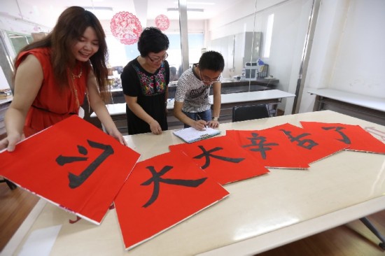 | Students in Beijing Normal University design a sign together. (People's Daily Online/Lin Hui) |