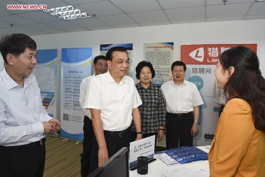 Chinese Premier Li Keqiang (C) visits a small and micro businesses hub in north China's Tianjin City, Sept. 11, 2014. Li Keqiang made an inspection tour of Tianjin on Thursday after attending the Summer Davos forum. (Xinhua/Li Xueren)