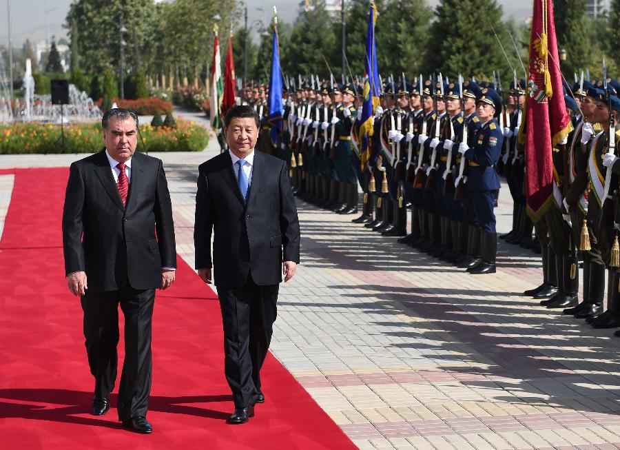 Chinese President Xi Jinping (2nd L) attends a welcoming ceremony held by Tajik President Emomali Rahmon (1st L) before their talks in Dushanbe, capital of Tajikistan, Sept. 13, 2014.(Xinhua/Ma Zhancheng)