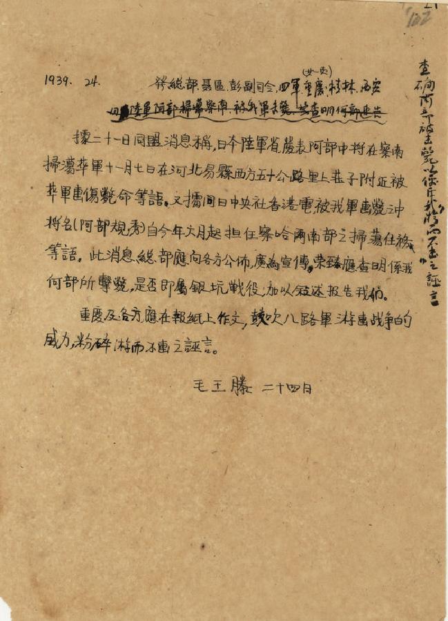 BEIJING, Sept. 13 -- China on Saturday released documents on a series of battles against the Japanese army in north China in 1939 as the country marks the 69th anniversary of the victory against Japanese aggressors.