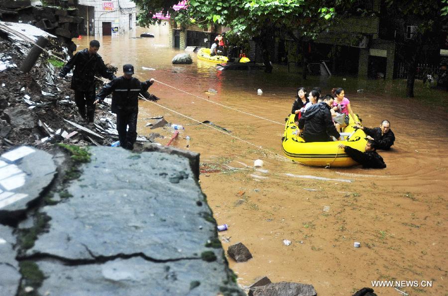 Rescuers try to transfer trapped people in Guang'an City, southwest China's Sichuan Province, Sept. 13, 2014. A persistent rainfalll hit Guang'an from early morning of Sept. 13, causing serious urban waterlogging and flooding some croplands. Relief works are underway. (Xinhua/Liu Suyue)