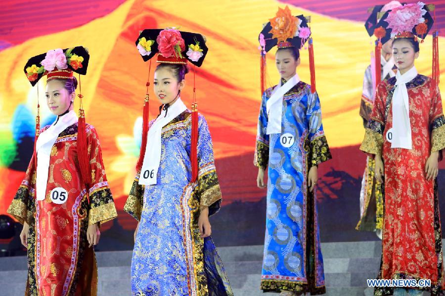 Contestants attend the evening dress session of the 9th Miss China Pageant final in Zhangbei county, north China's Hebei Province, Sept. 13, 2014. (Xinhua/Li Mingfang)