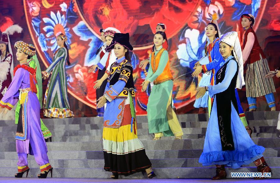 Contestants attend the evening dress session of the 9th Miss China Pageant final in Zhangbei county, north China's Hebei Province, Sept. 13, 2014. (Xinhua/Li Mingfang)