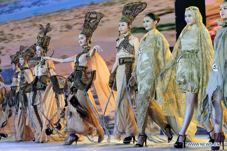 | Contestants attend the evening dress session of the 9th Miss China Pageant final in Zhangbei county, north China's Hebei Province, Sept. 13, 2014. (Xinhua/Li Mingfang) |