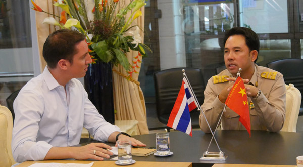 Mr. Itthiphol Kunplome (right), the Mayor of Pattaya, receives interview with People’s Daily Online in Pattaya City Hall. (People’s Daily Online/Wang Tianle)
