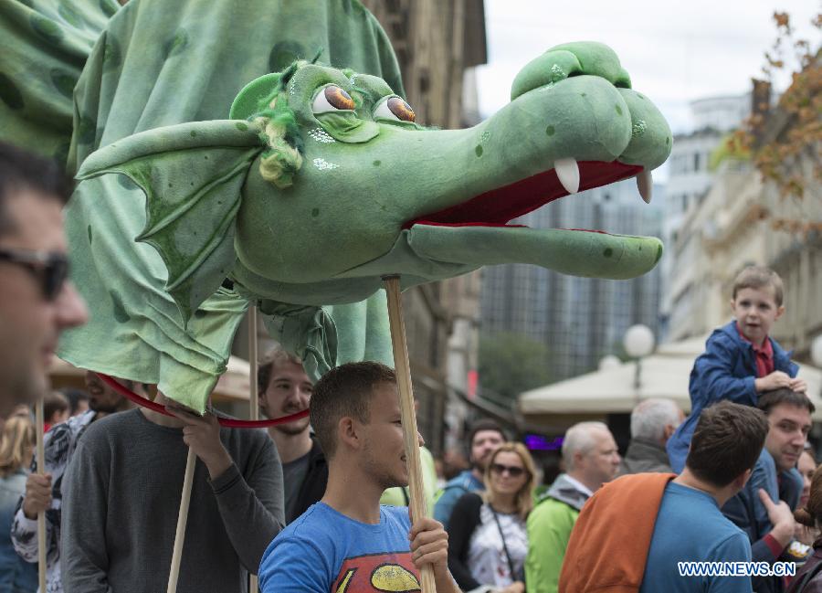 People take part in a puppet parade in Zagreb, capital of Croatia, on Sept. 13, 2014. The 47th International Puppet Theatre Festival will kick off here on Sept. 15. Puppet troupes from nine countries will participate in this five-day festival. (Xinhua/Miso Lisanin)