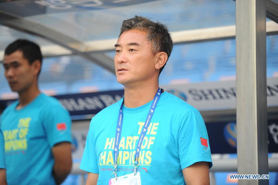 Fu Bo, head coach of China, reacts before the men's football first round group F match against the Democratic People's Republic of Korea (DPRK) at the 17th Asian Games in Incheon, South Korea, on Sept. 15, 2014. (Xinhua/Huang Zongzhi)