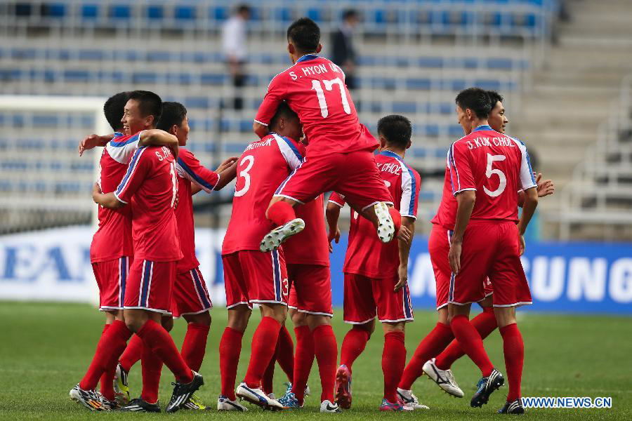 Players of the Democratic People's Republic of Korea (DPRK) celebrate for a goal during the men's football first round group F match against China at the 17th Asian Games in Incheon, South Korea, on Sept. 15, 2014. (Xinhua/Zhang Fan)