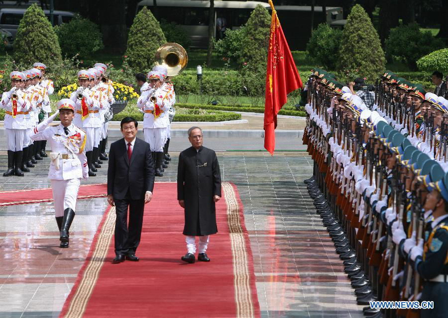 | Vietnamese President Truong Tan Sang (L, front) and Indian President Pranab Mukherjee (R, front) review the honor guards during a welcome ceremony in Hanoi, capital of Vietnam, Sept. 15, 2014. Indian President Pranab Mukherjee paid a state visit to Vietnam from Sept. 14 to 17. (Xinhua/VNA) |