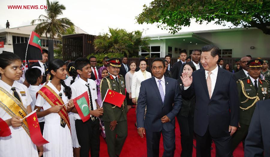 Chinese President Xi Jinping (2nd R, front) is accompanied by Maldivian President Abdulla Yameen (4th R, front) upon his arrival in Male, Maldives, Sept. 14, 2014. Xi Jinping arrived here Sunday for a state visit to Maldives. (Xinhua/Ju Peng)
