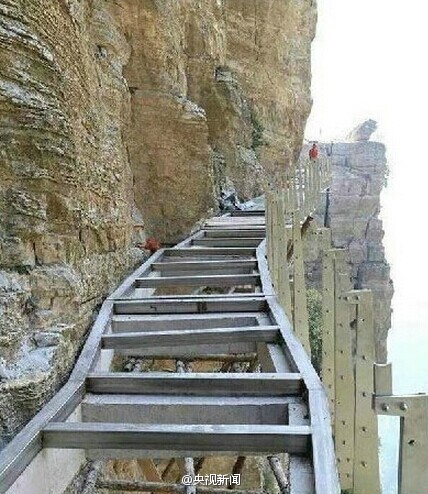 The construction of the longest, widest, and highest glass suspension walkway in China is to be completed soon in Baishi Mountain Resort, Laiyuan county of north China’s Hebei province, according to sources from the resort. It is estimated that the walkway will be open to public in the middle of September 2014.  (Photo/Weibo)