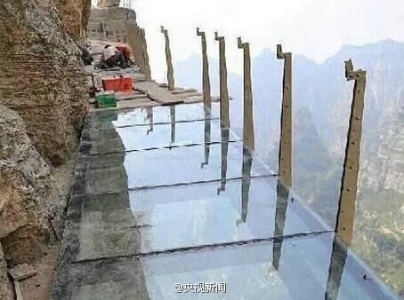 The construction of the longest, widest, and highest glass suspension walkway in China is to be completed soon in Baishi Mountain Resort, Laiyuan county of north China’s Hebei province, according to sources from the resort. It is estimated that the walkway will be open to public in the middle of September 2014.  (Photo/Weibo)