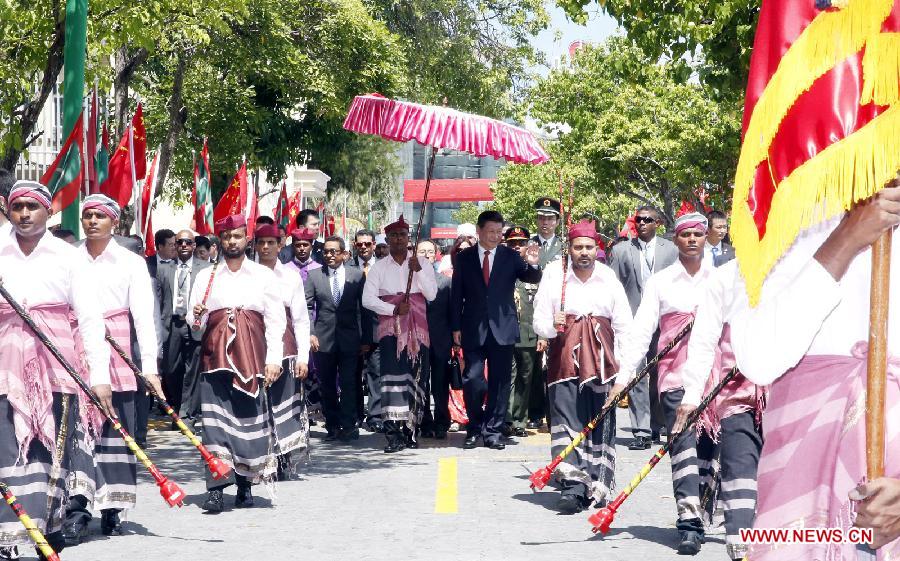 Maldivian President Abdulla Yameen Abdul Gayoom holds a welcome ceremony for Chinese President Xi Jinping before their talks in Male, Maldives, Sept. 15, 2014. (Xinhua/Ju Peng)