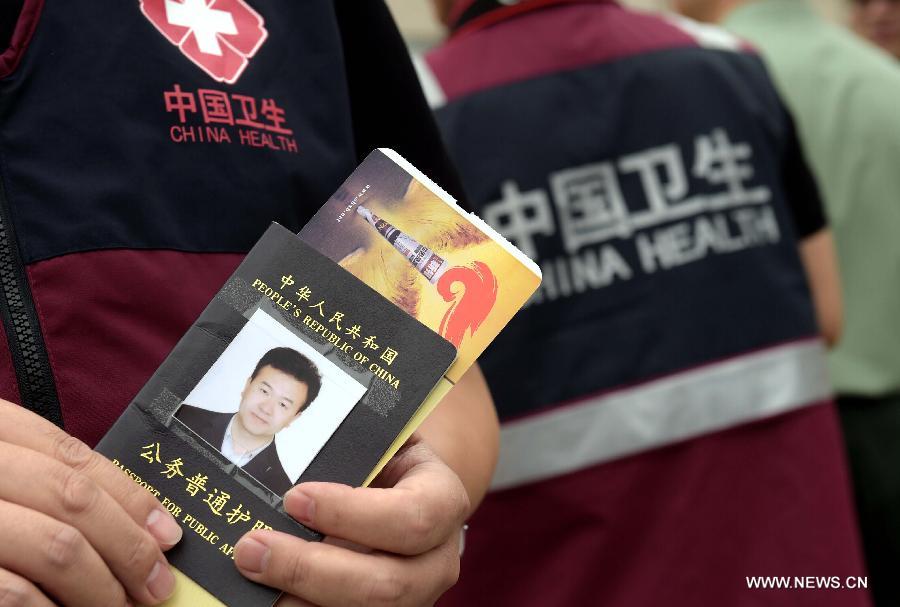 | Qian Jun, head of a Chinese laboratory team, holds his passport before departing for Sierra Leone to help West African countries to contain the Ebola epidemic, in Beijing, capital of China, Sept. 16, 2014. The 59-member team, based at the Sierra Leone-China Friendship Hospital in the outskirts of the capital, Freetown, will carry out lab screening and observation to help Sierra Leone to improve lab testing. (Xinhua/Jin Liangkuai) |