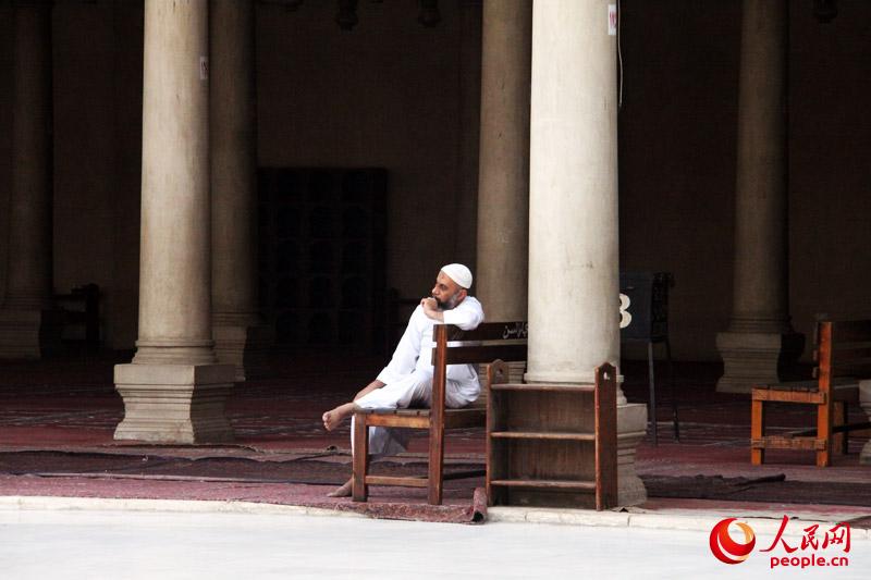 A believer sits outside a mosque in the city of Cairo, capital of Egypt on Sept. 14, 2014. (Photo/People's Daily Online)