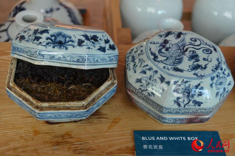 Tea in the boxes made of blue-and-white porcelain. (Photo/People's Daily Online)