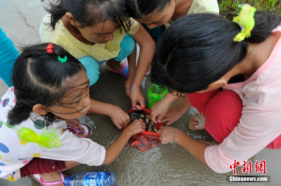 Children catch fish on the street in Wenchang, south China’s Hainan province on Sept. 16, 2014. (Photo/Chinanews.com)