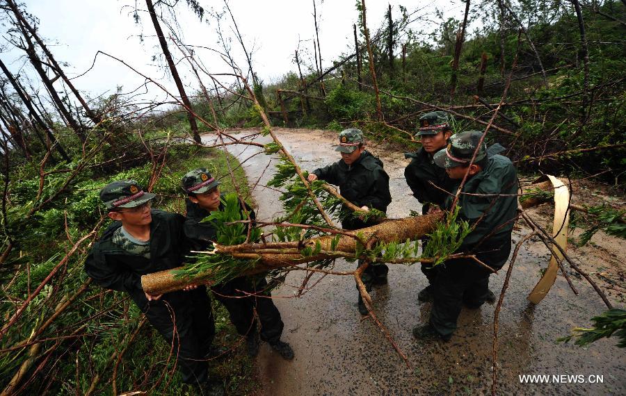 | Soldiers clean a road in Wengtian Town of Wenchang City, south China's Hainan Province, Sept. 16, 2014. The Typhoon Kalmaegi made landfall in Wengtian at a speed of 40 meters per second at 9:40 a.m. It is the fifteenth typhoon to hit China this year. (Xinhua/Zhao Yingquan) |