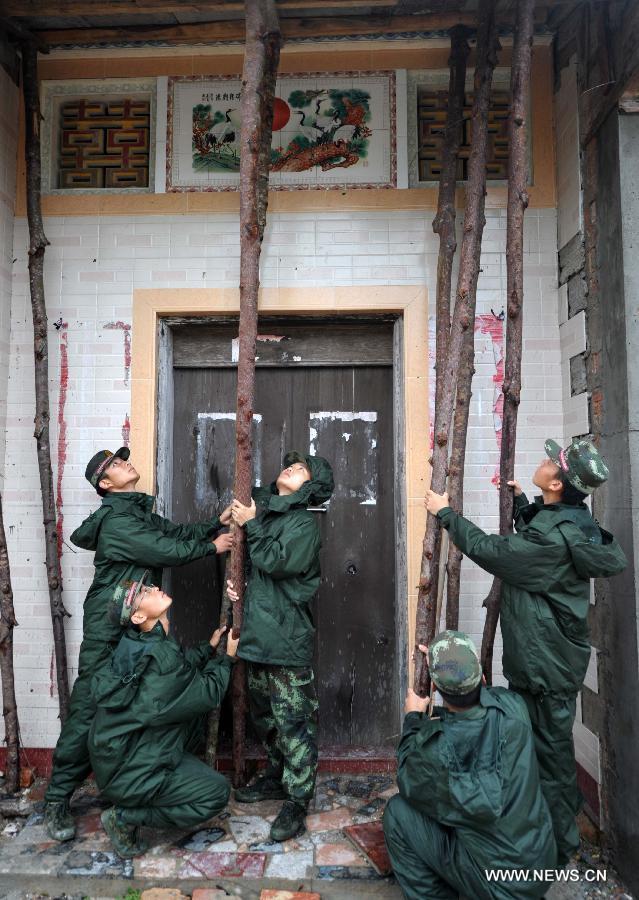 Soldiers help local residents strengthen houses to fight against Typhoon Kalmaegi in Nanfeng Village under Wengtian Town of Wenchang City, south China's Hainan Province, Sept. 16, 2014. The typhoon made landfall in Wengtian at a speed of 40 meters per second at 9:40 a.m. It is the fifteenth typhoon to hit China this year. (Xinhua/Zhao Yingquan)