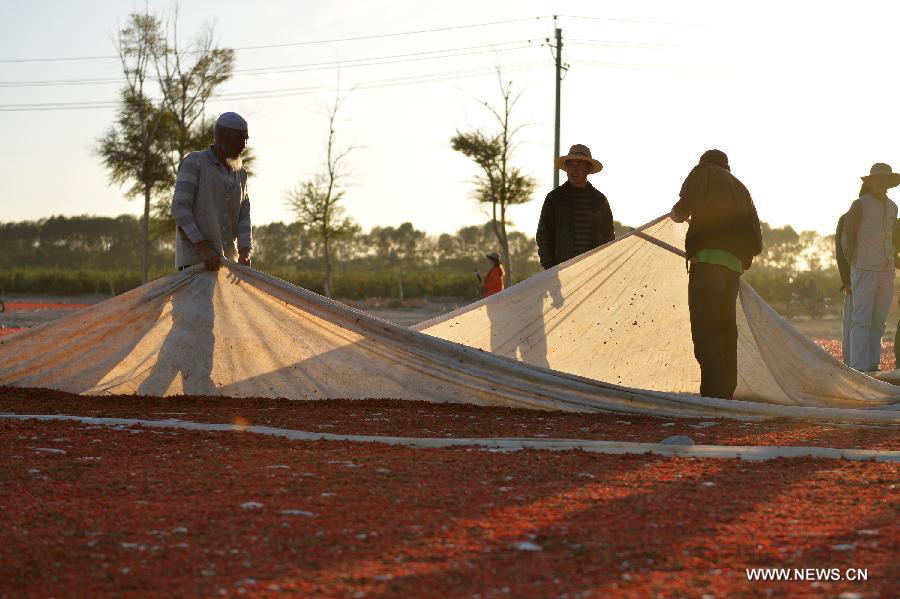 | Farmers dry Chinese wolfberry in Dulan County of northwest China's Qinghai Province, Sept. 16, 2014. The output of Chinese woldberry in Dulan County reached 30,000 tons in 2014, with the production value of 900 million RMB yuan (145.8 million U.S. dollars). (Xinhua/Liu Dongjun) |