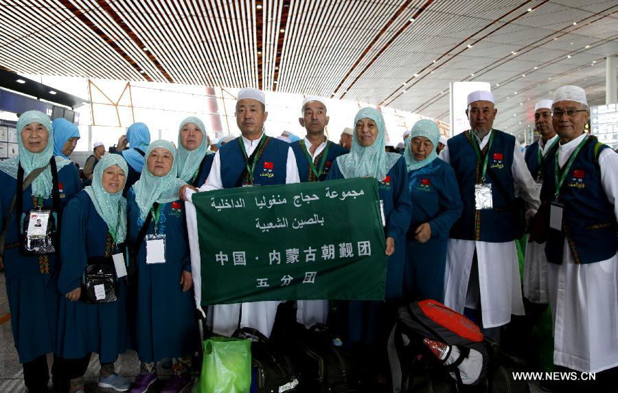 Muslim pilgrims wave goodbye at Beijing Capital International Airport in Beijing, China, Sept. 17, 2014. About 14,500 Chinese pilgrims are scheduled to go to Mecca for an annual pilgrimage this year. The Mecca pilgrimage, also known as the Hajj, is a Muslim religious tradition that specifies that all able-bodied Muslims who can afford to travel to Saudi Arabia must visit Mecca at least once in their lives. (Xinhua/Pan Xu)