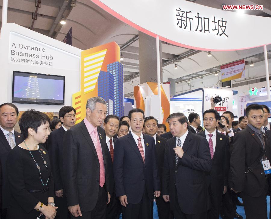 Chinese Vice Premier Zhang Gaoli (3rd L, front) and Singapore Prime Minister Lee Hsien Loong (2nd L, front) attend the launching of the Singapore section during the 11th China-ASEAN Expo, also the 11th China-ASEAN Business and Investment Summit, in Nanning, capital of south China's Guangxi Zhuang Autonomous Region, Sept. 16, 2014. (Xinhua/Wang Ye)