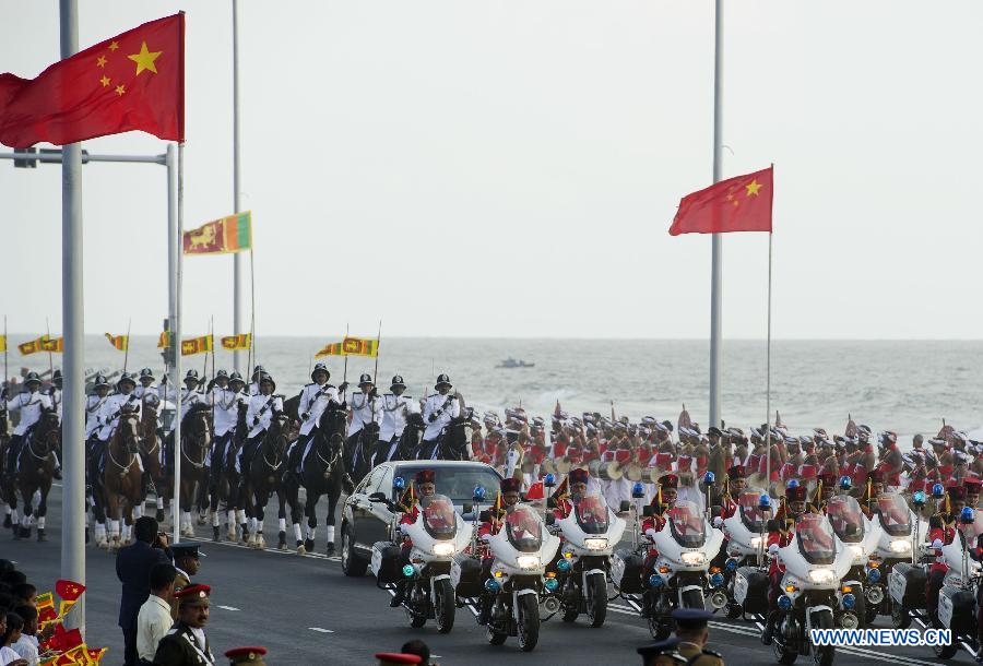 The car of Chinese President Xi Jinping and his wife Peng Liyuan is escorted to the welcoming ceremony held by Sri Lankan President Mahinda Rajapaksa in Colombo, Sri Lanka, Sept. 16, 2014. (Xinhua/Xie Huanchi)