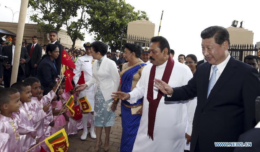 Chinese President Xi Jinping (R) and his wife Peng Liyuan (4th R) wave to children during the welcoming ceremony held by Sri Lankan President Mahinda Rajapaksa (2nd R) in Colombo, Sri Lanka, Sept. 16, 2014. (Xinhua/Ju Peng)
