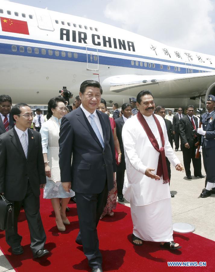 Chinese President Xi Jinping (L, front) and his wife Peng Liyuan (3rd L) are welcomed by Sri Lankan President Mahinda Rajapaksa (R, front) upon their arrival in Colombo, Sri Lanka, Sept. 16, 2014. Xi Jinping arrived here Tuesday for a state visit to Sri Lanka. (Xinhua/Ju Peng)