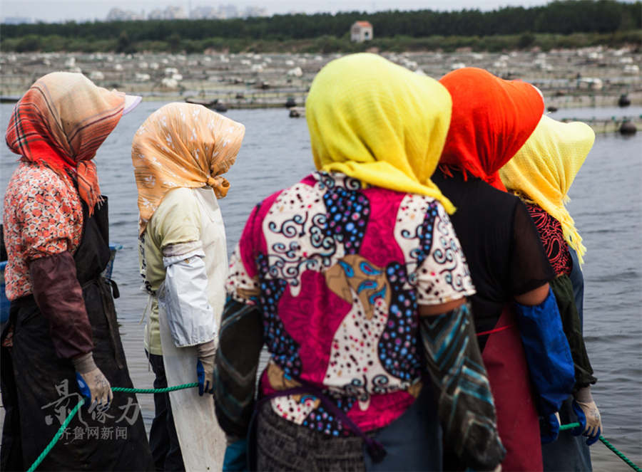 Women workers watch on the shore. Their varied and colorful hats form beautiful scenery. (www.iqilu.com/ Feng Xingcai)