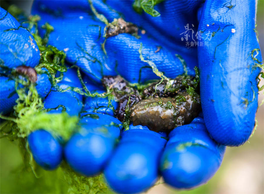 Workers collect sea slugs. (www.iqilu.com/ Feng Xingcai)