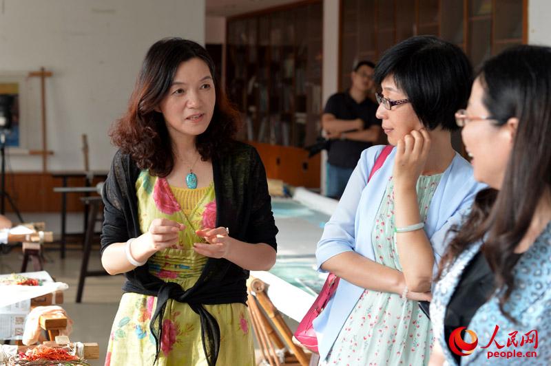 Yao Jianping introduces both-side embroidery to journalists. (People's Daily Online/Weng Qiyu)