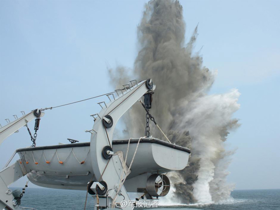Photo taken on Sept. 15, 2014 show a minesweeper of South China Sea Fleet successfully detonating a smart mine in training. (Photo./81.cn)