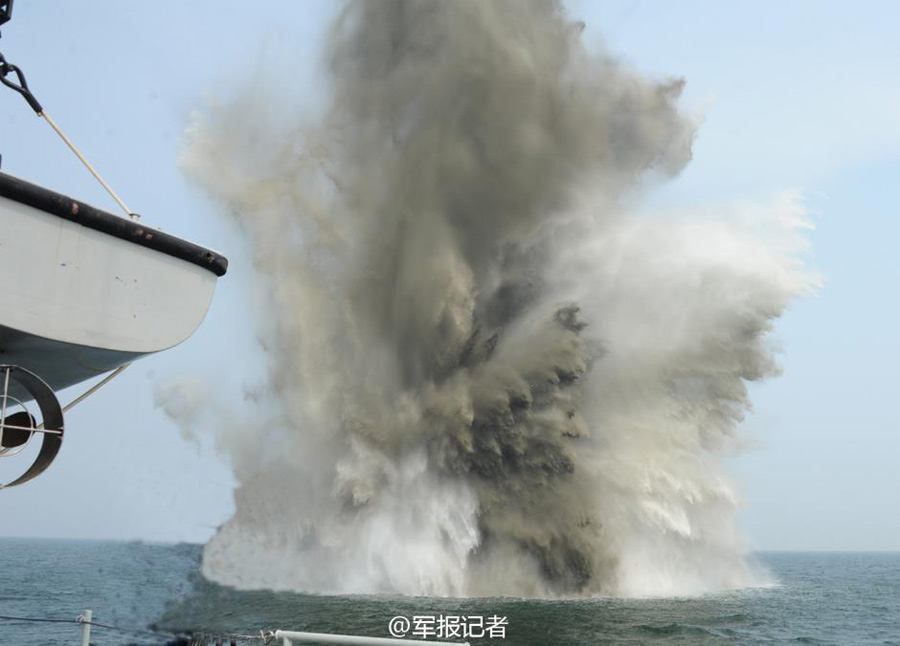 Photo taken on Sept. 15, 2014 show a minesweeper of South China Sea Fleet successfully detonating a smart mine in training. (Photo./81.cn)