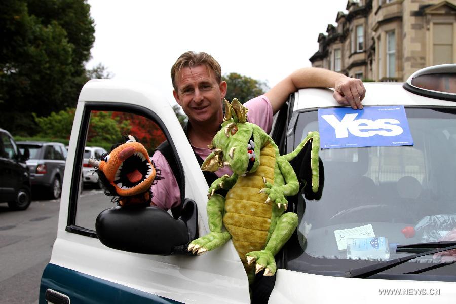 A taxi driver shows his self-made puppets and a sign of supporting Scotland's independence, in Edinburgh, Britain, Sept. 17, 2014. The Scottish Independence Referendum will take place here on September 18, 2014. (Xinhua/Guo Chunju)