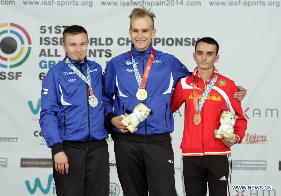 Finland's Jani Suoranta (C) and Mika Kinisjarvi (L) and Armenia's Razmik Minasyan greet the spectators during the awarding ceremony for 10m Running Target Men Junior at the 51st World Championship of the ISSF (International Shooting Sport Federation) at Granada, Spain, Sept. 17, 2014. Jani Suoranta won the title of the event. (Xinhua)
