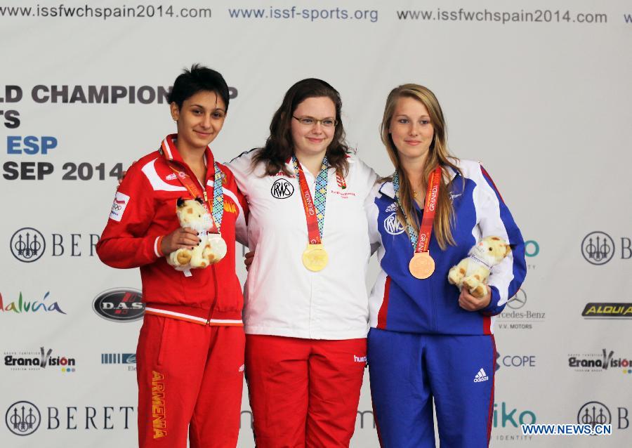 Hungary's Veronika Major (C), Armenia's Lilit Mkrtchyan (L) and France's Florence Louis greet the spectators during the awarding ceremony for 10m Running Target Women Junior at the 51st World Championship of the ISSF (International Shooting Sport Federation) at Granada, Spain, Sept. 17, 2014. Veronika Major won the title of the event. (Xinhua)