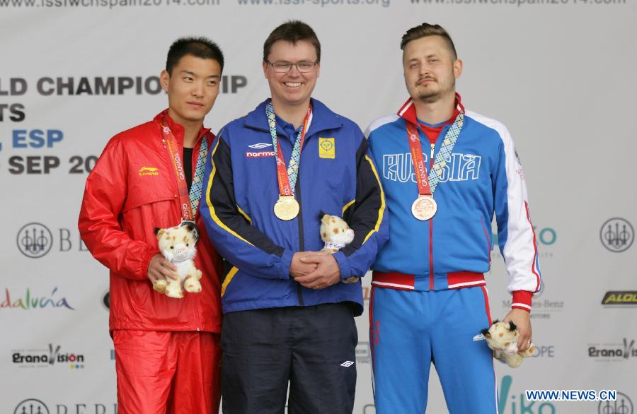 Sweden's Emil Martinsson (C), China's Zhai Yujia (L) and Russia's Dmitry Romanov greet the spectators during the awarding ceremony for 10m Running Target Men at the 51st World Championship of the ISSF (International Shooting Sport Federation) at Granada, Spain, Sept. 17, 2014. Emil Martinsson won the title of the event. (Xinhua)