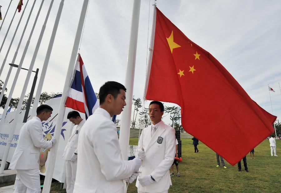 The Chinese delegation to the 17th Asian Games holds flag-raising ceremony at the Athletes' Village in Incheon, South Korea, Sept. 18, 2014. (Xinhua/Xie Haining)