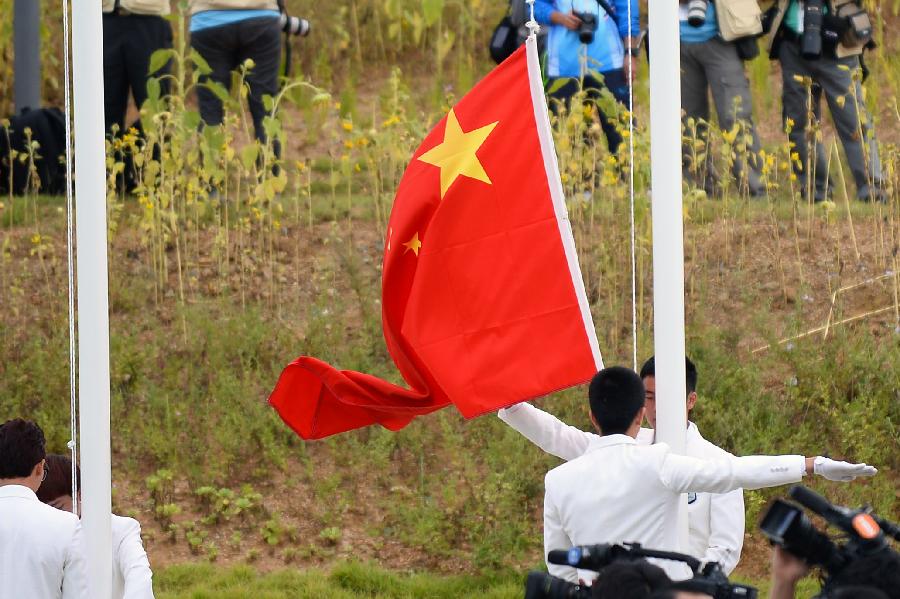 China's national flag is raised during the flag-raising ceremony of the Chinese delegation at the Athletes' Village of the 17th Asian Games in Incheon, South Korea, Sept. 18, 2014. (Xinhua/Zhu Zheng)