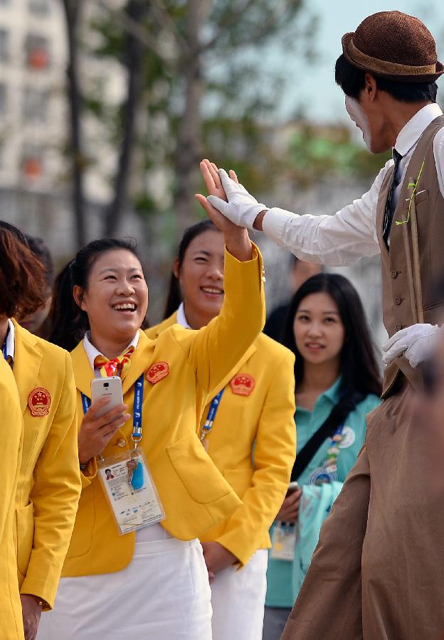 Athletes of Chinese delegation interact with a staff member during a flag-raising ceremony at the Athletes' Village in Incheon, South Korea, Sept. 18, 2014. The Chinese delegation to the 17th Asian Games held flag-raising ceremony at the Athletes' Village on Thursday. (Xinhua/Zhu Zheng)