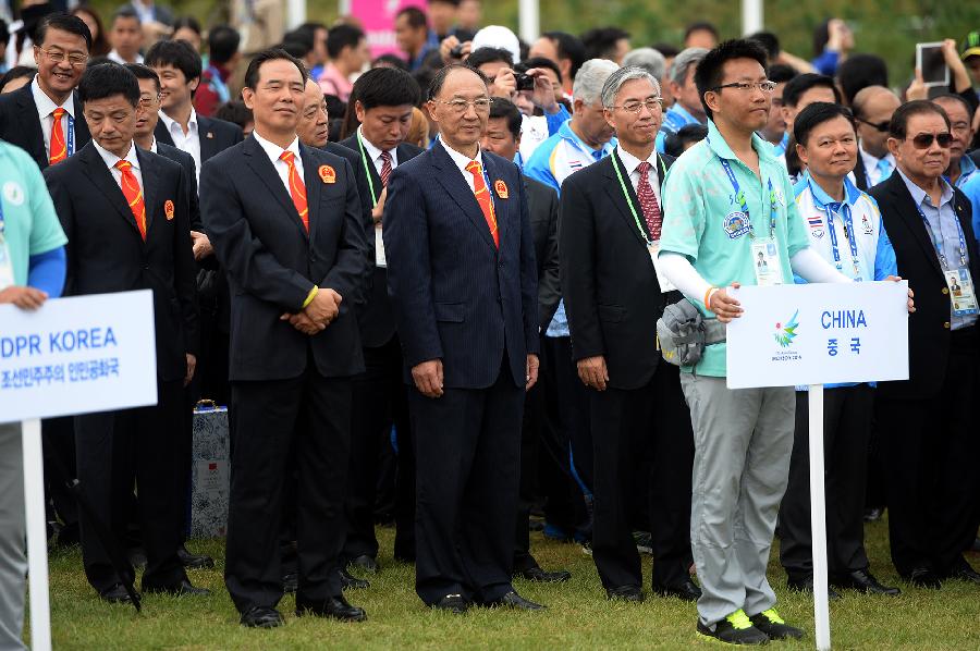 Liu Peng (3rd L, front), chef de mission of Team China, attends a flag-raising ceremony at the Athletes' Village in Incheon, South Korea, Sept. 18, 2014. The Chinese delegation to the 17th Asian Games held flag-raising ceremony at the Athletes' Village on Thursday. (Xinhua/Han Yuqing)