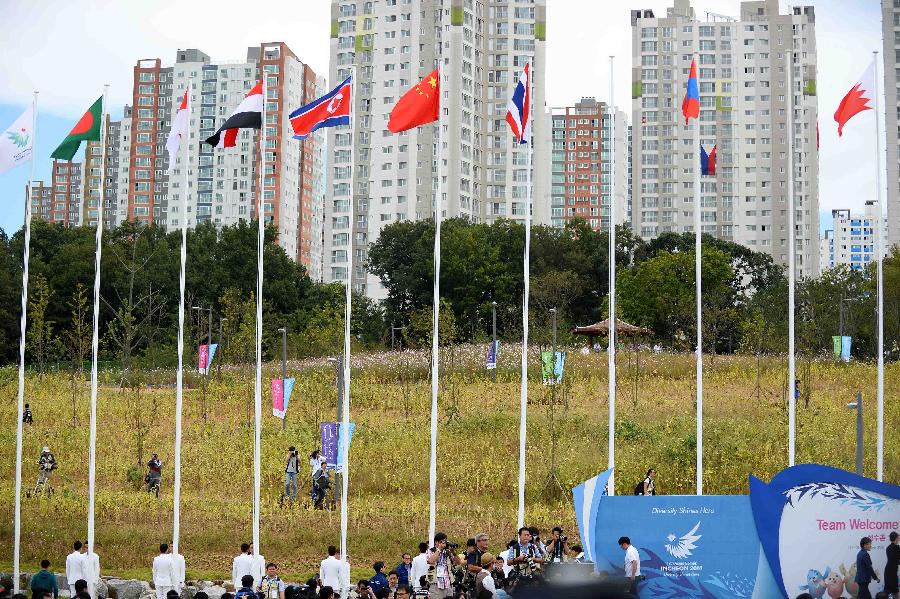 China's national flag is raised during the flag-raising ceremony of the Chinese delegation at the Athletes' Village of the 17th Asian Games in Incheon, South Korea, Sept. 18, 2014. (Xinhua/Zhu Zheng)