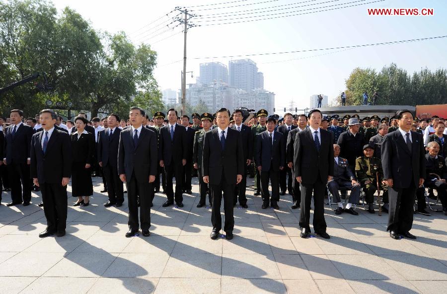 | Liu Yunshan (C, front), a member of the Standing Committee of the Political Bureau of the Communist Party of China (CPC) Central Committee, and other delegates sing the national anthem at a ceremony to mark the 83rd anniversary of the 9.18 Incident, in Shenyang, capital of northeast China's Liaoning Province, Sept. 18, 2014. On Sept. 18, 1931, Japanese troops blew up a section of the railway under their control near Shenyang, and then accused Chinese troops of sabotage as a pretext for attack. They bombarded barracks near Shenyang the same evening, beginning a large-scale armed invasion of northeast China. The incident was followed by Japan's full-scale invasion of China and the rest of Asia, triggering the war against Japanese aggression. (Xinhua/Rao Aimin) |